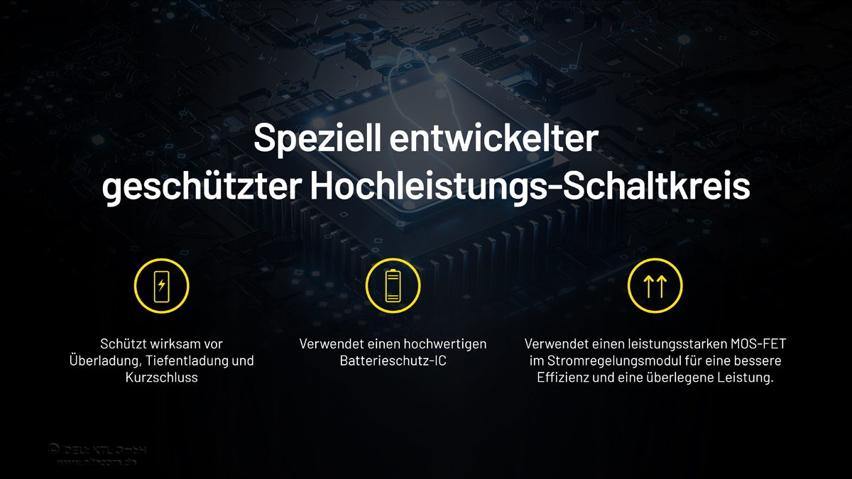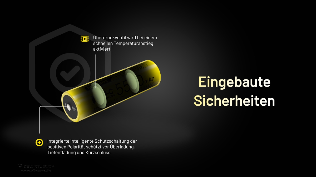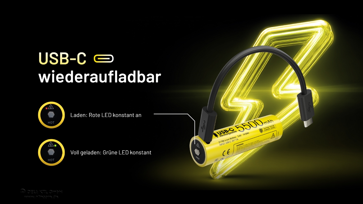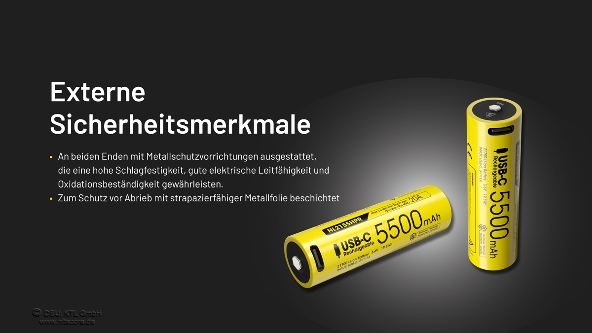 Der Akku ist durch eine Schutzschaltung gegen Überspannung, Tiefentladung und Kurzschluss geschützt. Der 21700er Akku findet nun mehr und mehr in leistungsstarken Taschenlampen Anwendung um die Brenndauer zu verlängern.