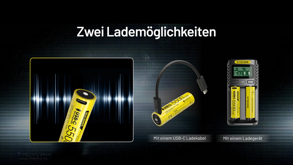 Zum Laden sind folgende Ladegeräte geeignet: Ci2, Ci4, UI1, UI2, UM2, UM4, UMS2 und UMS4 oder auch direkt über den integrierten USB-C-Ladeport!