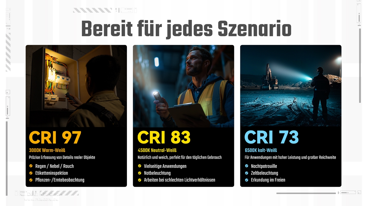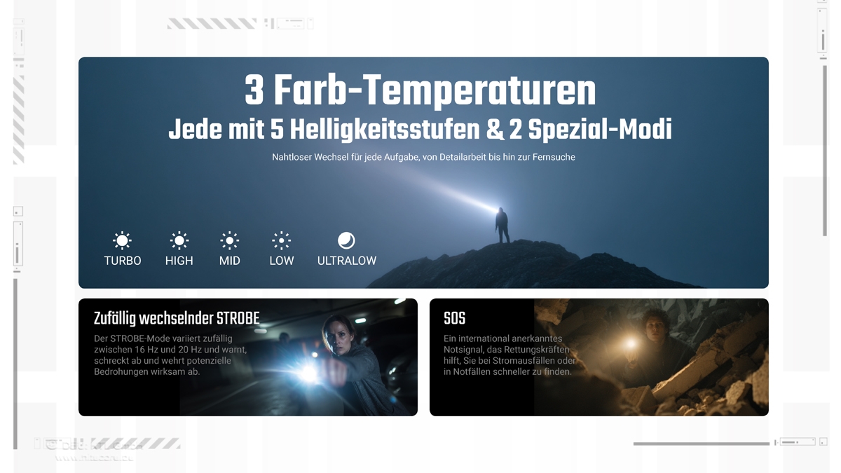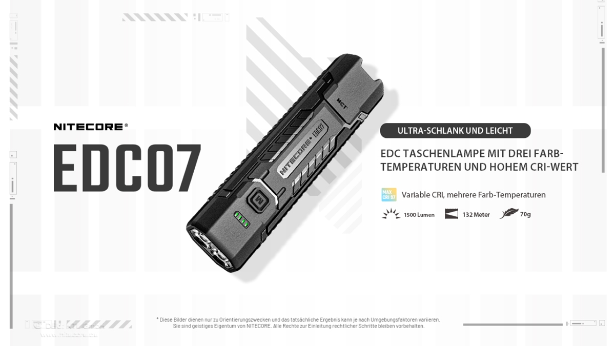 Die Nitecore EDC07 ist das Einsteigermodell der EDC-Taschenlampenserie von Nitecore. Die zwei Quad-Core-MCT-UHE-LEDs (Multi Color Temperature) leisten maximal 1500 Lumen. Die MCT-LED´s können drei Farbtemperaturen darstellen: 6500K Cool White (CRI 73), 4500K Neutral White (CRI 83), 3000K Warm White (CRI 97).