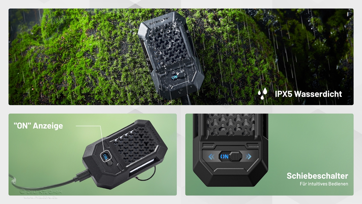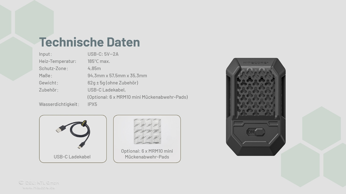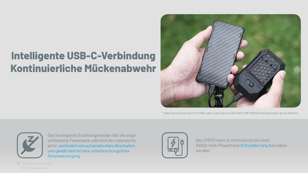 Nitecore EMR15 ist ein handliches Gerät zur Mückenabwehr. Der EMR15 muss an eine externe Stromquelle, z. B.: eine Powerbank, angeschlossen werden, um den Wirkstoff aus dem Wirkstoffplättchen zu verdampfen.