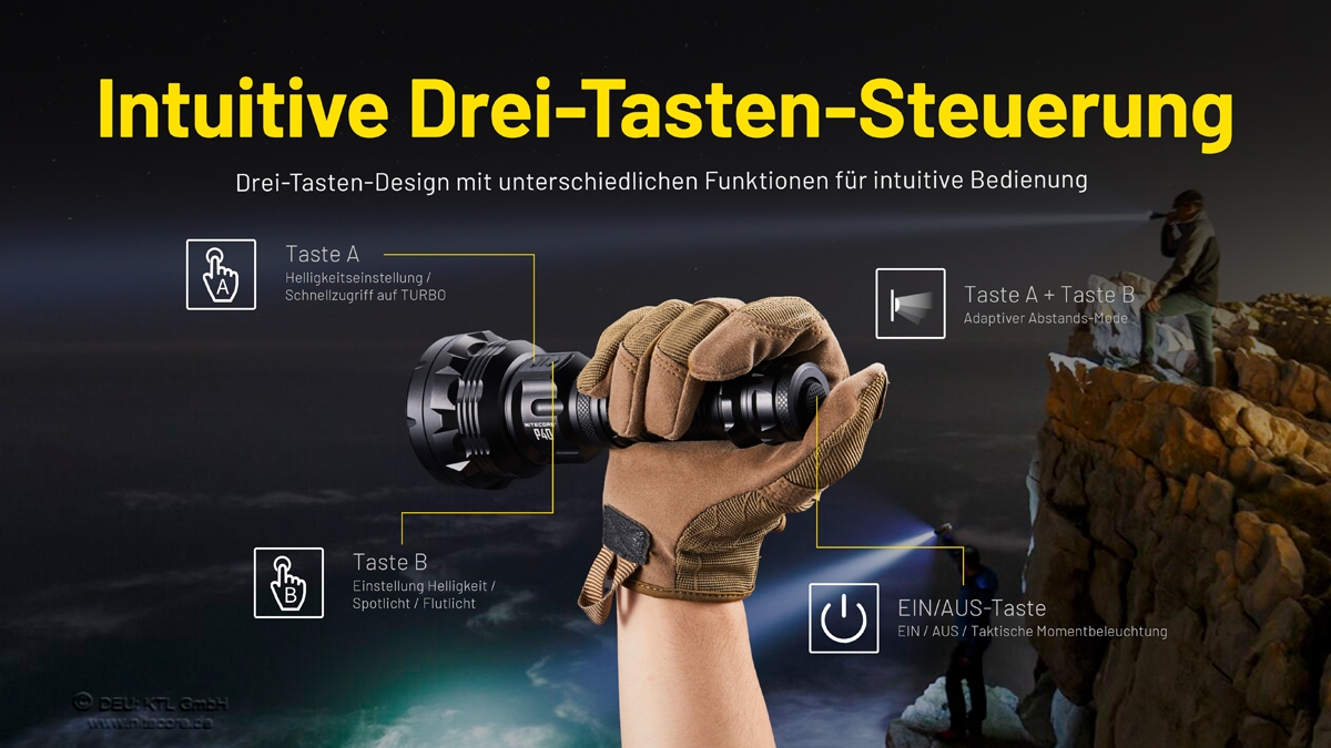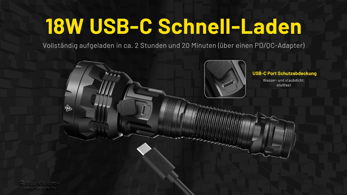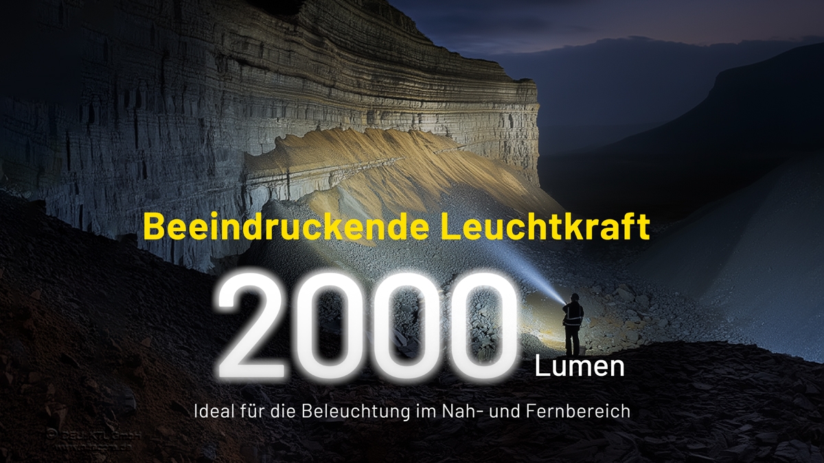 *Die TURBO-Stufe von 2000 Lumen ist nur bei Verwendung eines wiederaufladbaren 21700-Li-Ionen-Akkus mit einem Entladestrom über 8 A erreichbar.