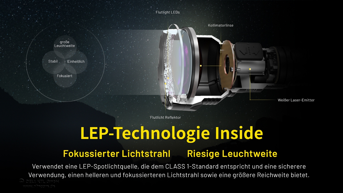 Eine LEP (Laser Excited Phosphor) Taschenlampe ist eine Taschenlampe, die einen gebündelten blauen Laserstrahl verwendet, um eine Phosphorschicht anzuregen, die dann weißes Licht emittiert. Dieses Licht kann dann durch eine Linse fokussiert werden, um einen sehr schmalen, fokussierten Strahl mit hoher Reichweite zu erzeugen.