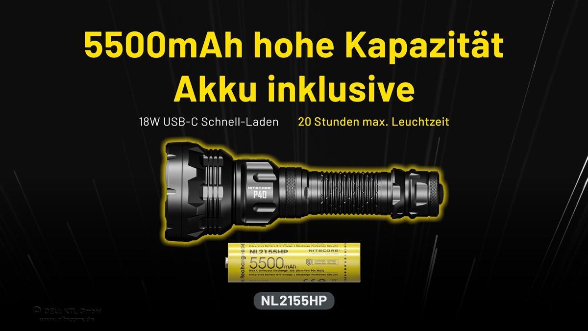 Lieferumfang: Nitecore P40, Holster, USB-C Ladakabel, Li-Ion Akku NL21550HP (5500mAh), Ersatz-Dichtringe, Lanyard