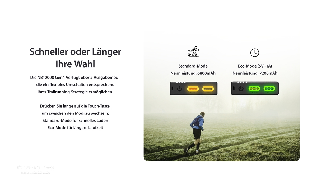 Eco- und Regular-Modus: Umschaltbare Energiemodi für längere Laufzeit oder höhere Ladeleistung