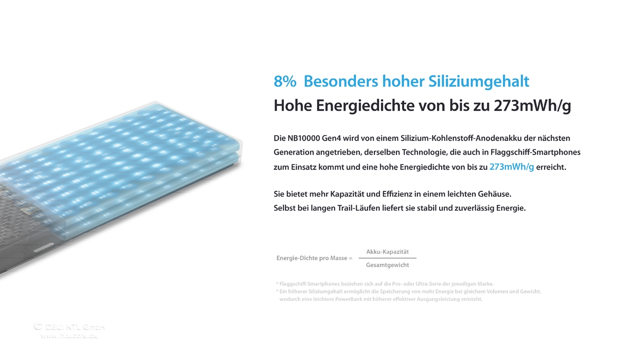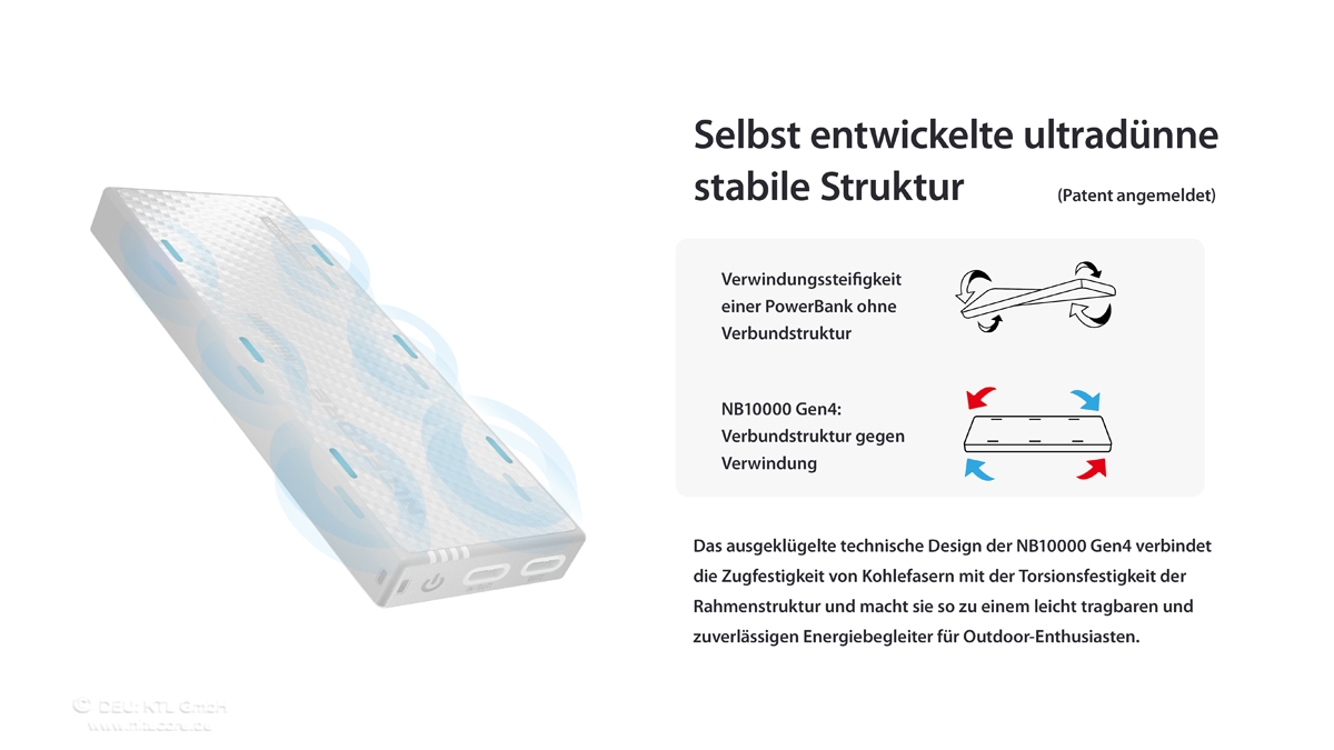Trotz einer Kapazität von 10.000mAh bringt die NB10000 Gen4 nur ca. 143 g auf die Waage - möglich durch eine leichte Carbon-Faser-Konstruktion und ein innovatives Silicon-Carbon-Anoden-Akkudesign, das eine hohe Energiedichte bei geringem Gewicht bietet.