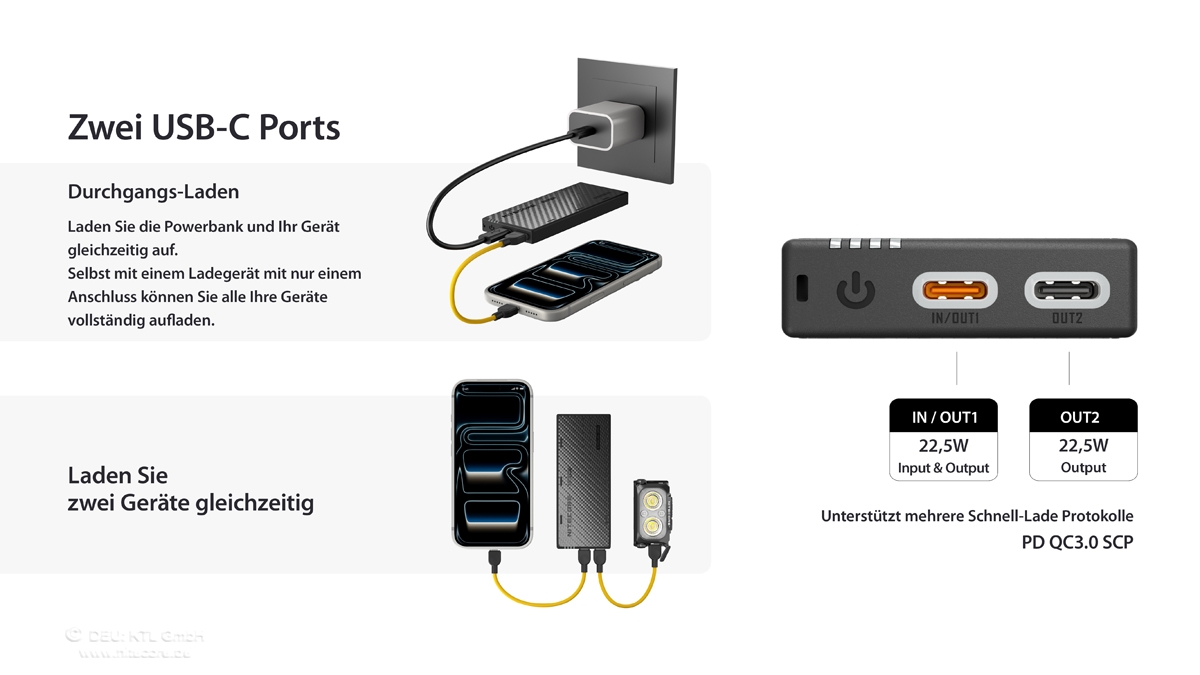 Zwei USB-C Anschlüsse ermöglichen gleichzeitig das Laden von zwei Geräten oder Pass-Through-Laden (gleichzeitiges Laden von Powerbank und Geräten)