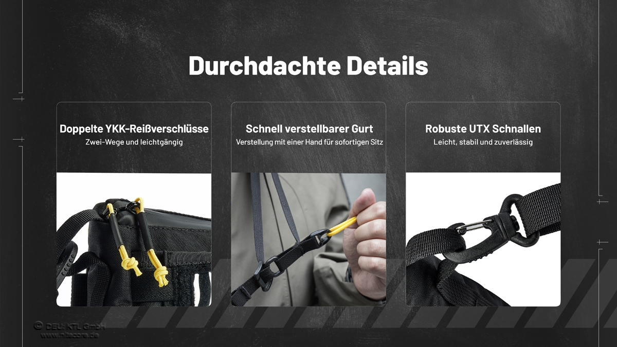 Gefertigt aus robustem 500D Nylon ist die Tasche besonders widerstandsfähig gegen Abrieb und tägliche Beanspruchung. Hochwertige YKK-Reißverschlüsse und langlebige UTX-Schnallen garantieren zusätzliche Zuverlässigkeit im Einsatz.