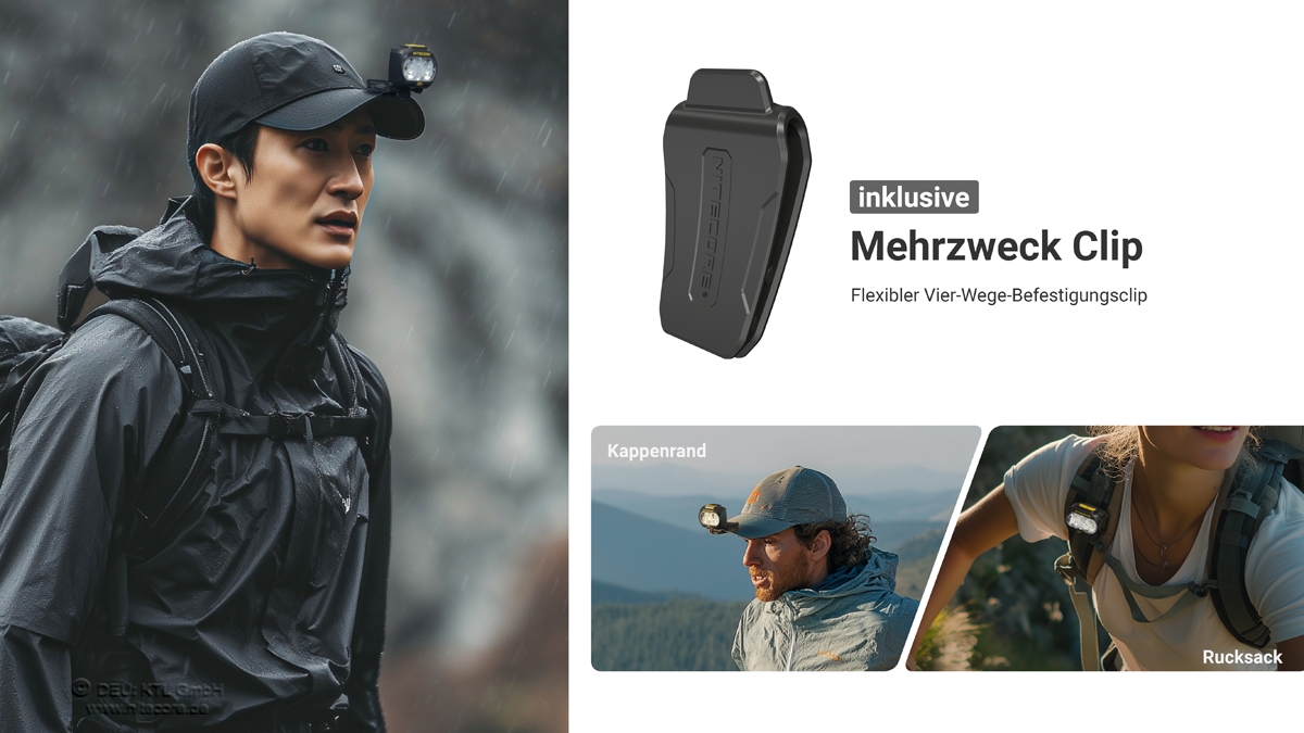 Lieferumfang: Nitecore UT27 MCT, HLB1500 Li-Ion Akku mit 1500mAh, USB-C-Ladekabel, Diffusor-Aufbewahrungsbeutel, Clip