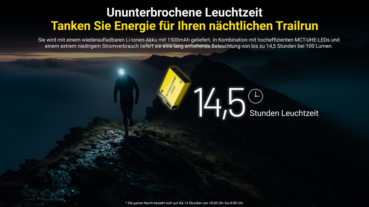 LOW (100 Lumen) für ca. 14 Stunden 30 Minuten