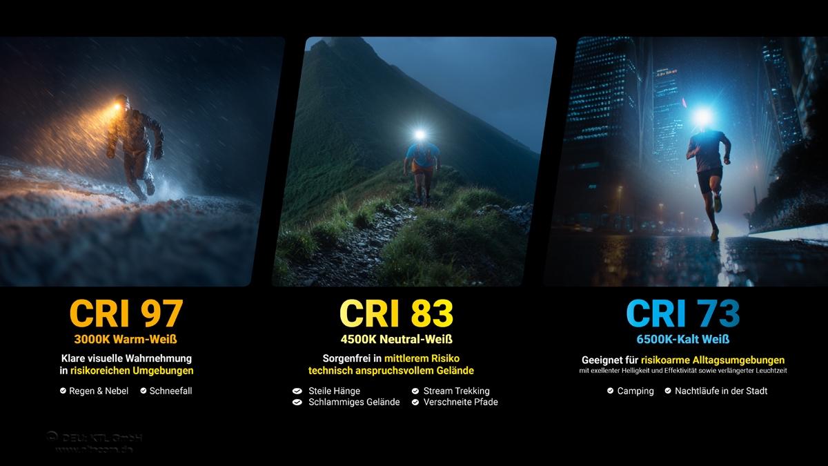Bei Bedarf wählbar zwischen 3000 K (Warm White, CRI 97), 4500 K (Neutral White, CRI 83) und 6500 K (Cool White, CRI 73) - so kannst du je nach Wetterlage, Umgebung oder Einsatz die optimale Lichtcharakteristik einstellen.